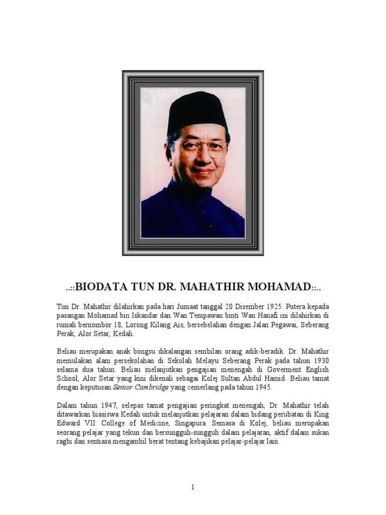 Dr Mahathir Latar Belakang Tun Dr Mahathir Bin Mohamad Yang Juga Digelar Sebagai Dr M Dan Nama Penanya Che Det Dilahirkan Pada 20 Disember 1925 Di Course Hero