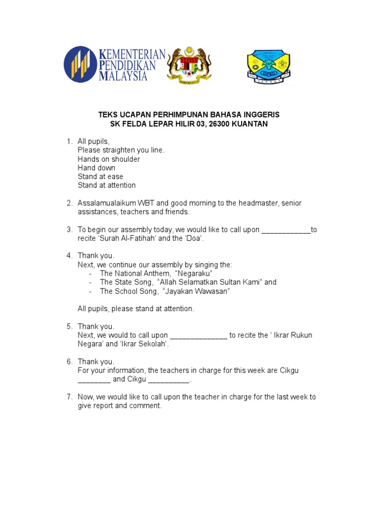 Teks Pengacara Majlis Perhimpunan Sekolah Dalam Bahasa Inggeris Sumber Pendidikan