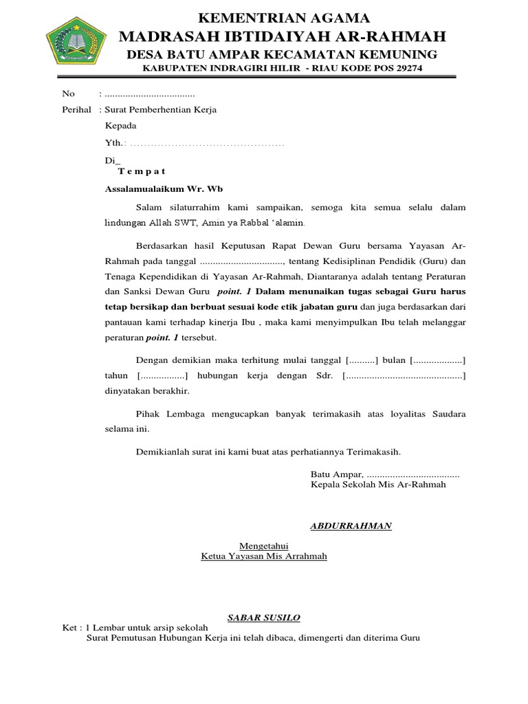 Contoh Surat Pemberhentian Kerja Guru Dari Kepala Sekolah Contoh Seputar Surat